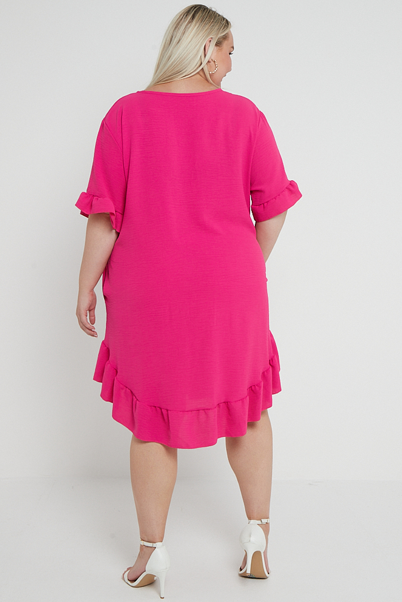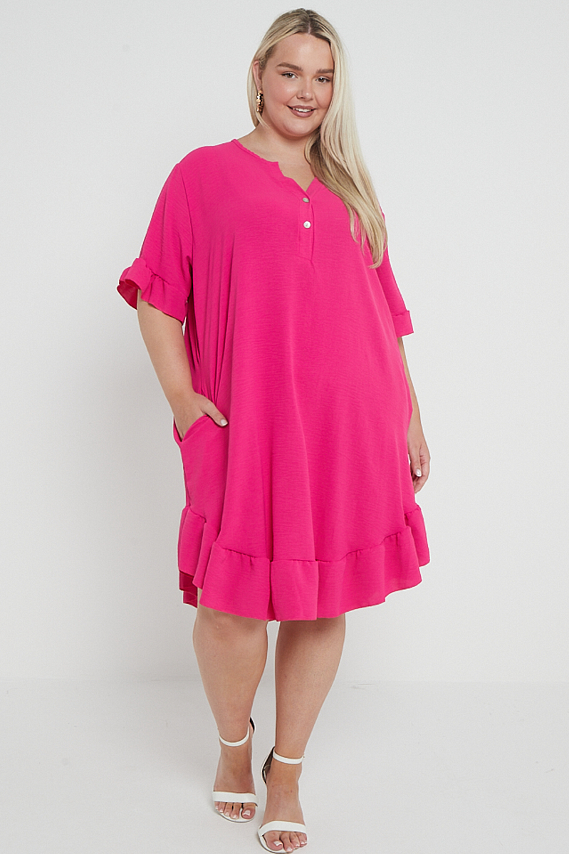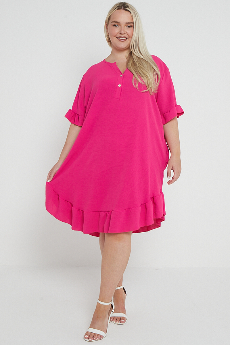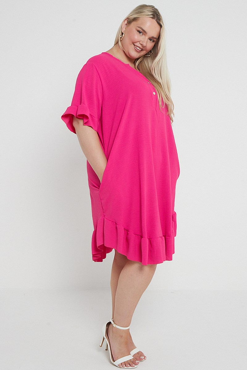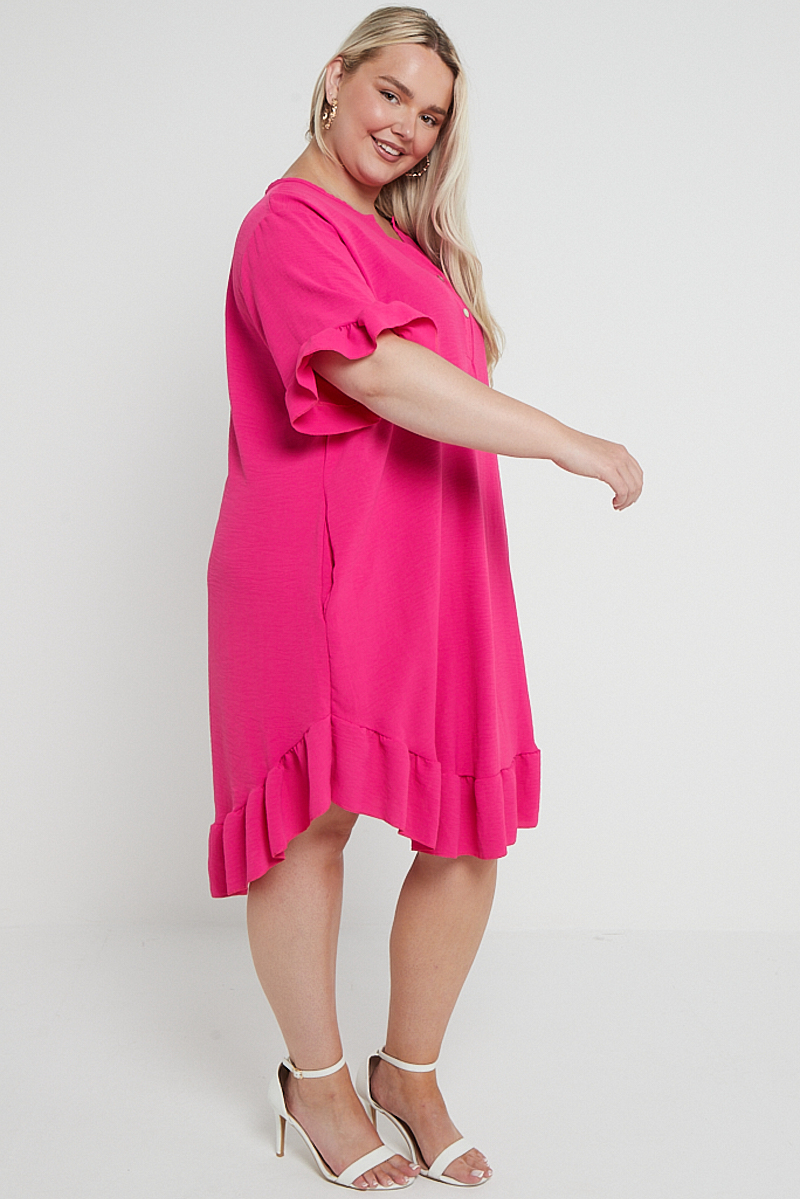 Plus Size Pink Button Top Frill Detail Short Sleeve Dress With Pockets x 5