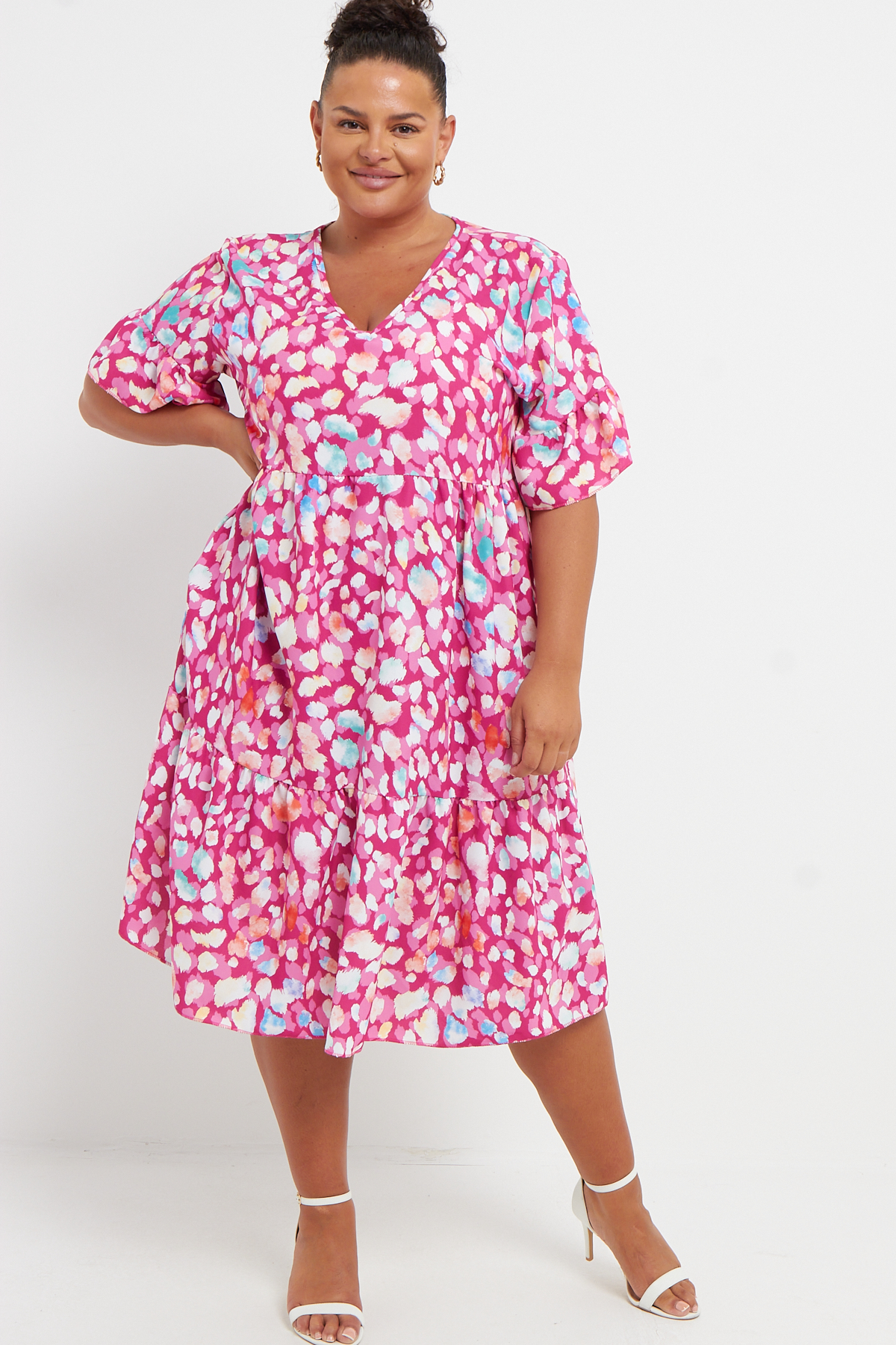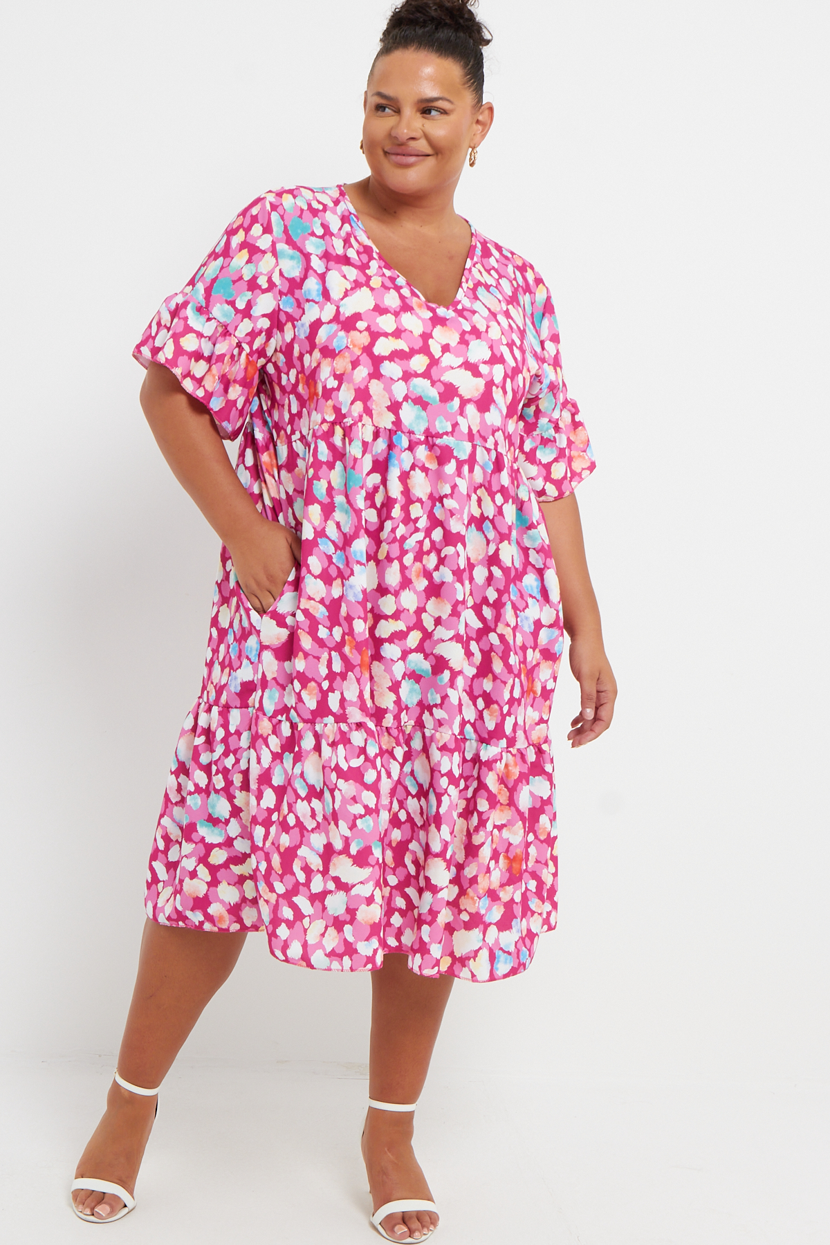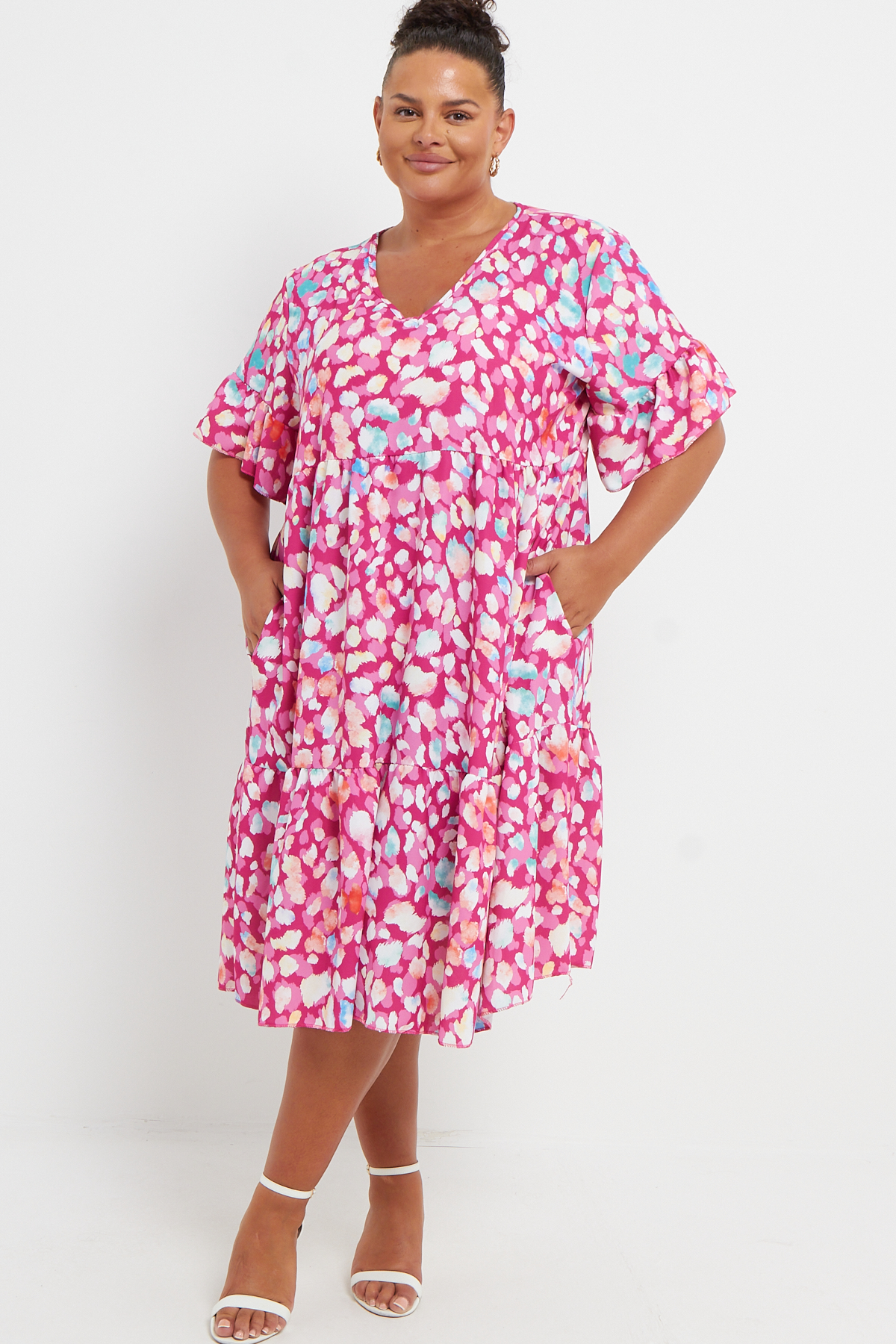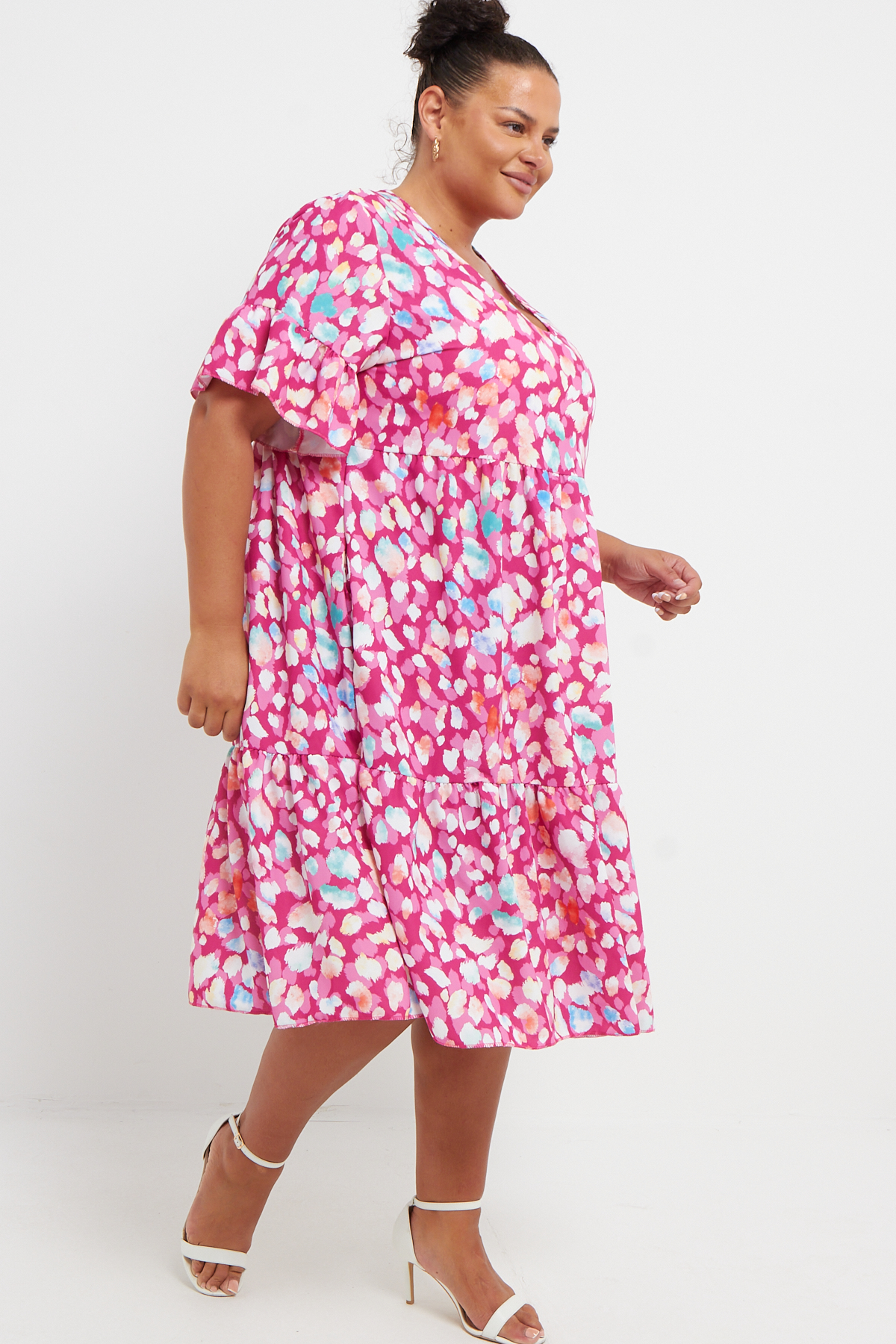 Plus Size Pink Multi Print Short Sleeve Frill Detail Mini Dress With Pockets x 6