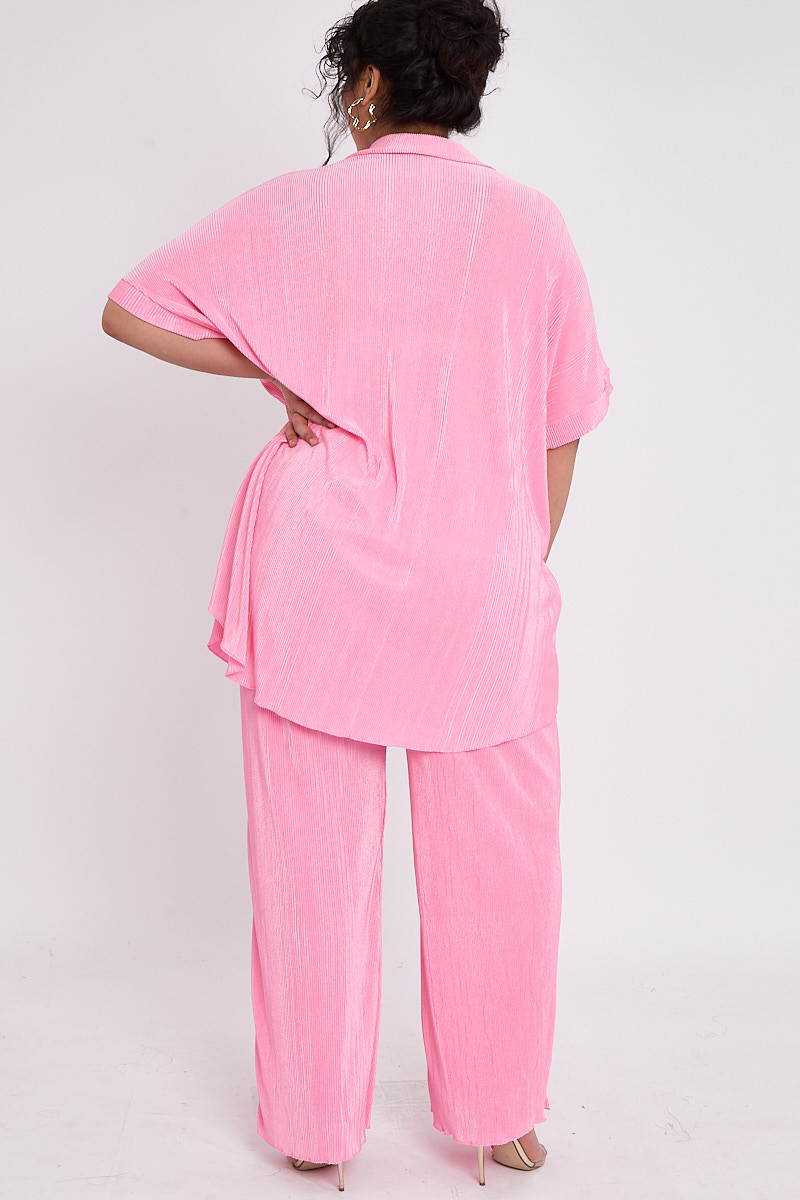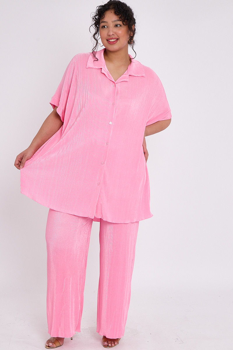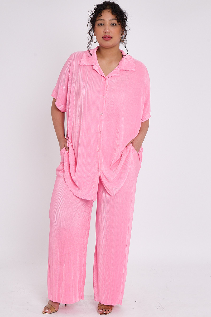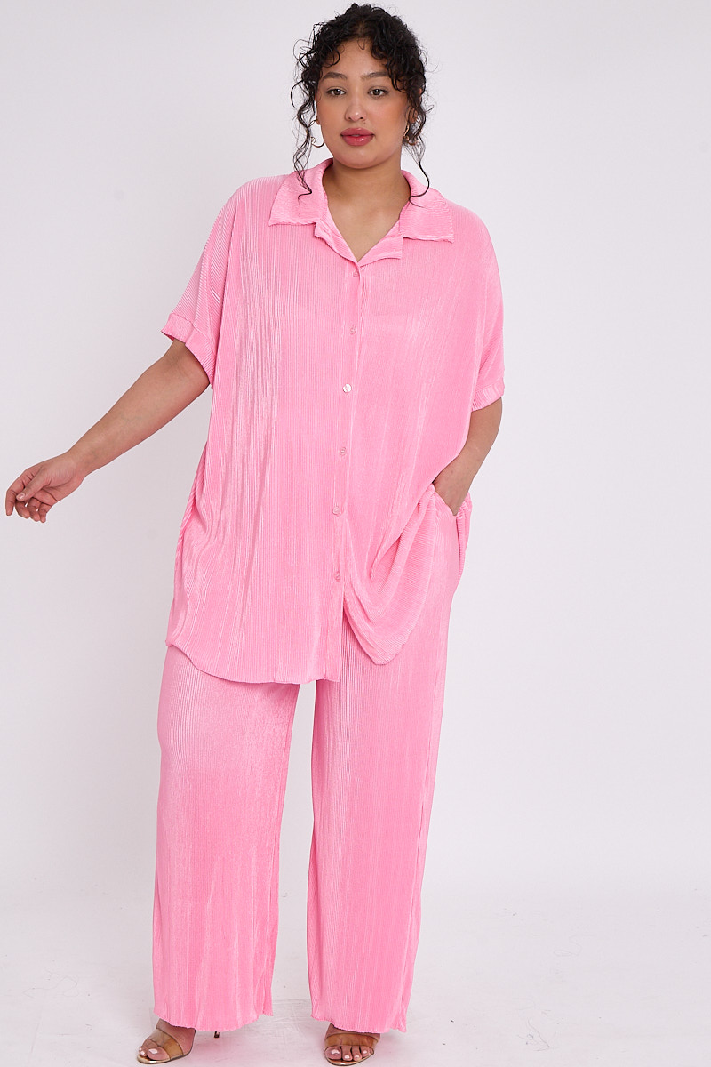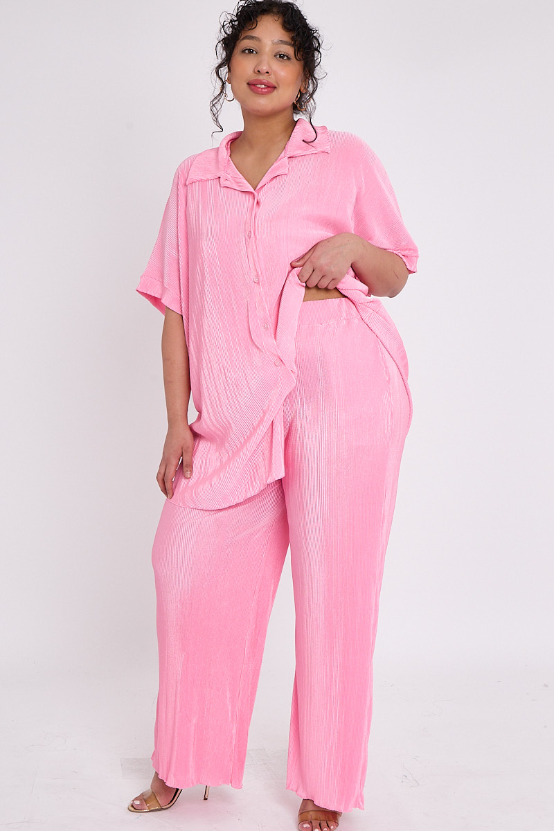Plus Size Pink Plisse Pleat 2 Piece Co Ord Set With Short Sleeve Shirt & Wide Leg Trousers x 5