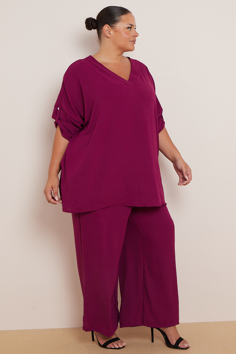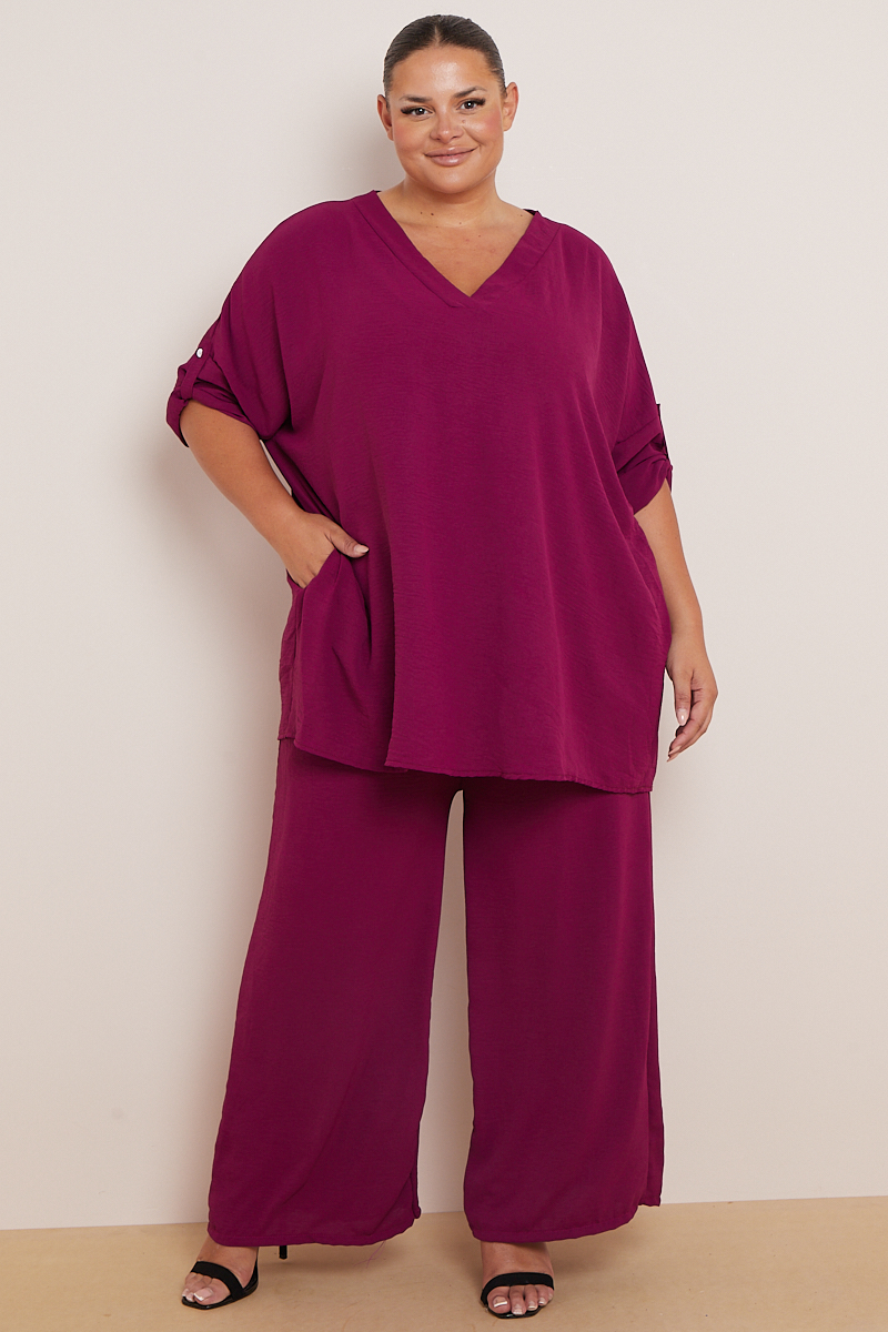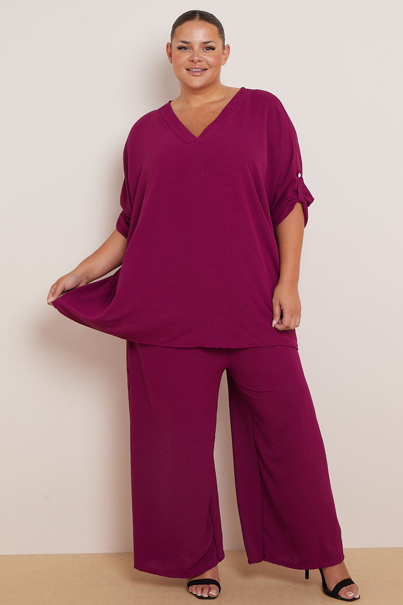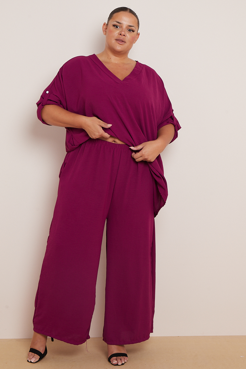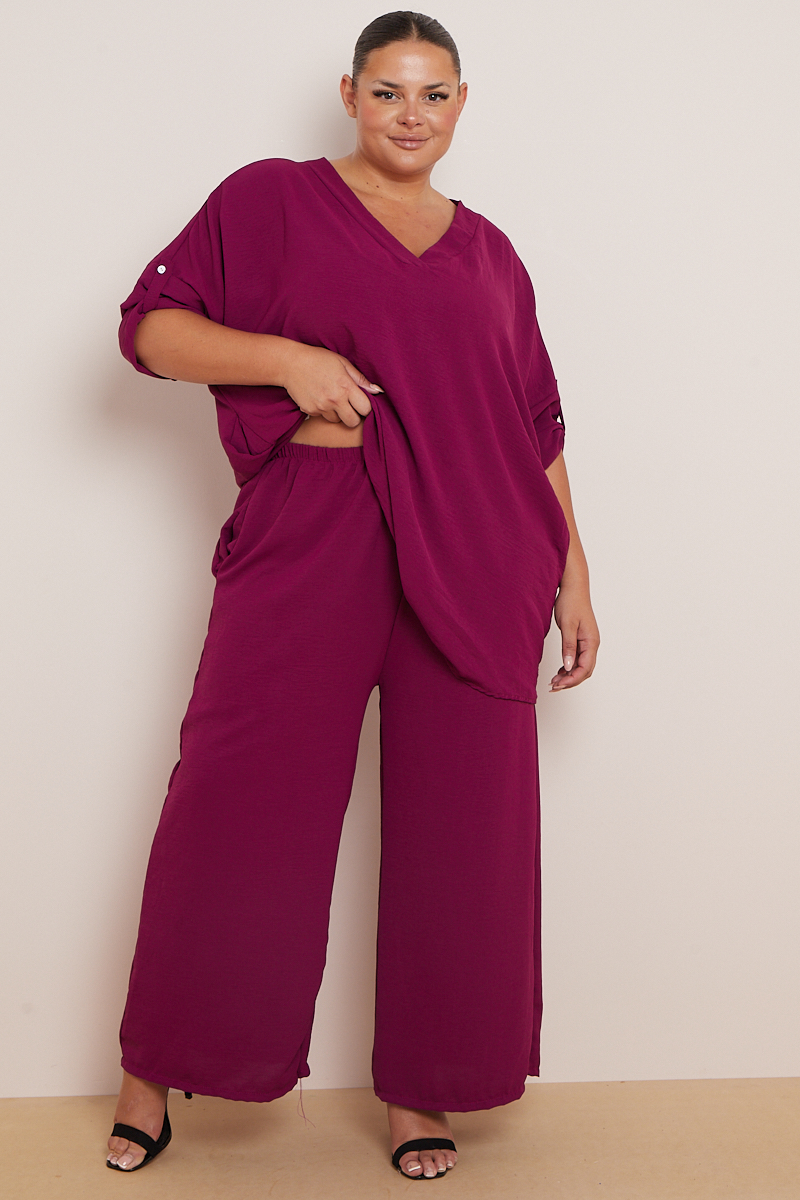 Plus Size Plum 2 Piece Co Ord Set With Mid Length Top & Wide Leg Trousers x 5