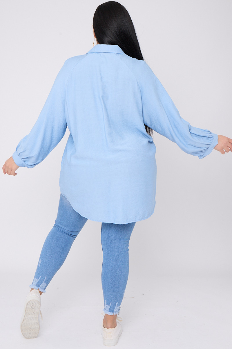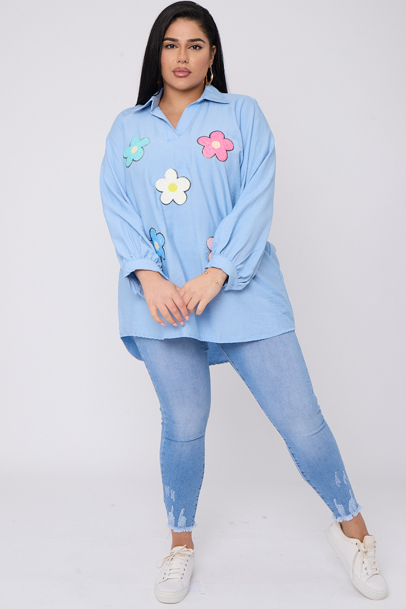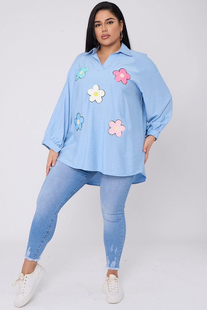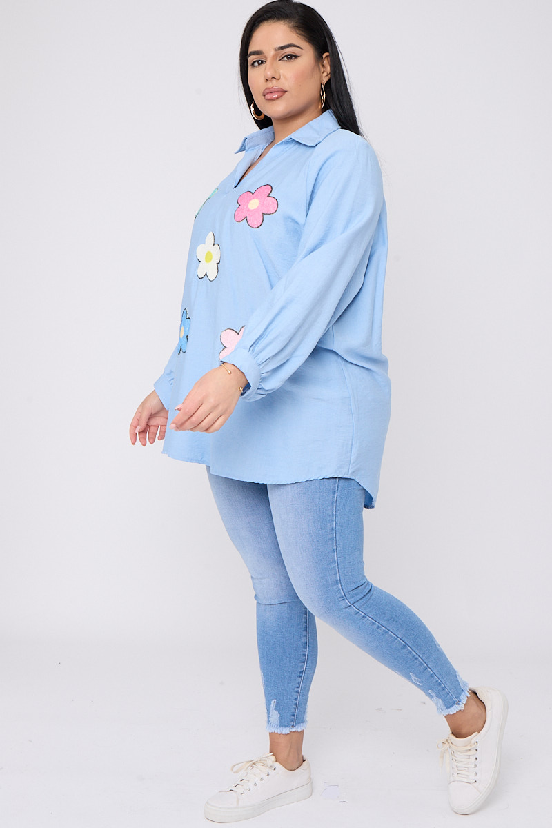 Plus Size Powder Blue Floral Print Shirt Collar Style Blouse x 5