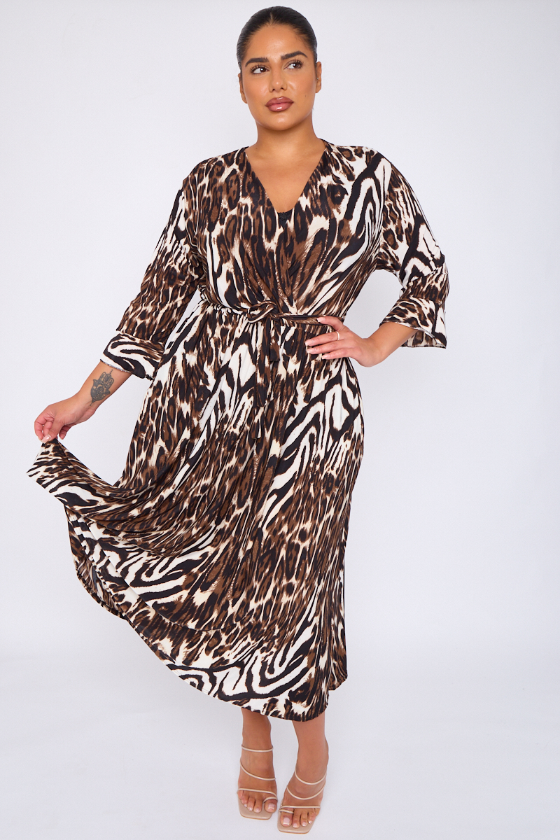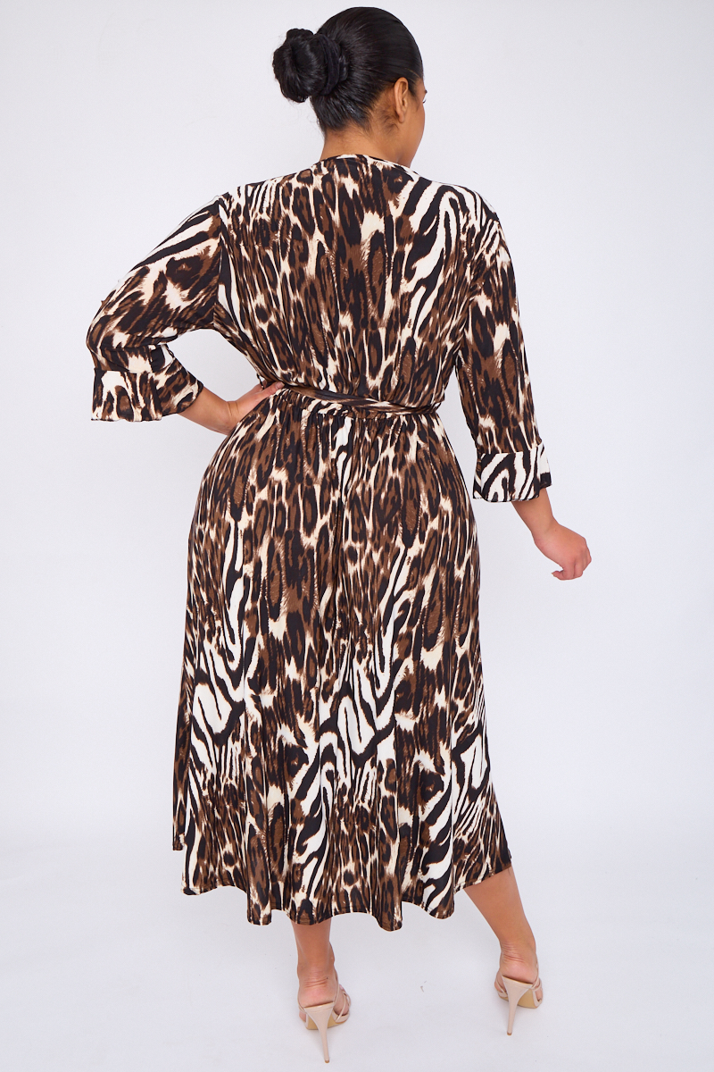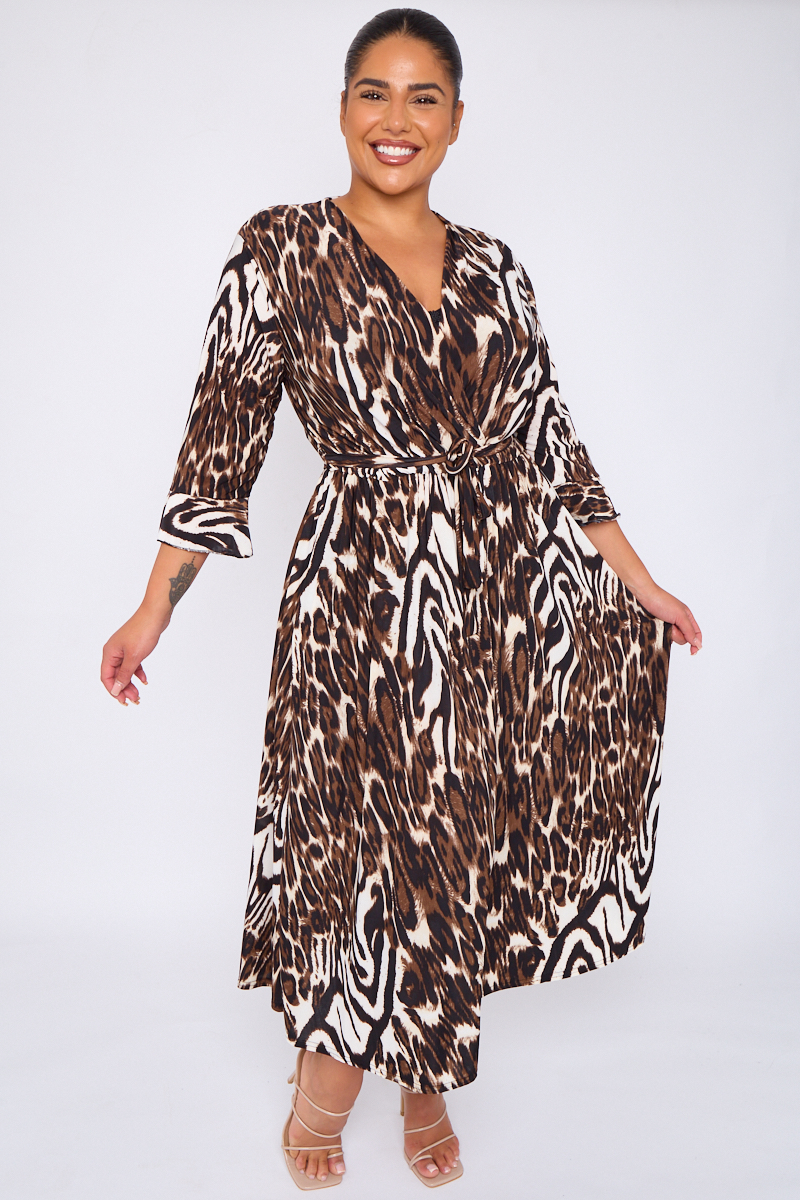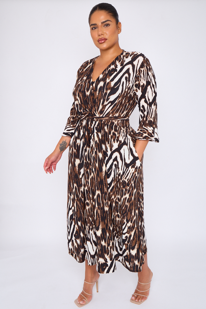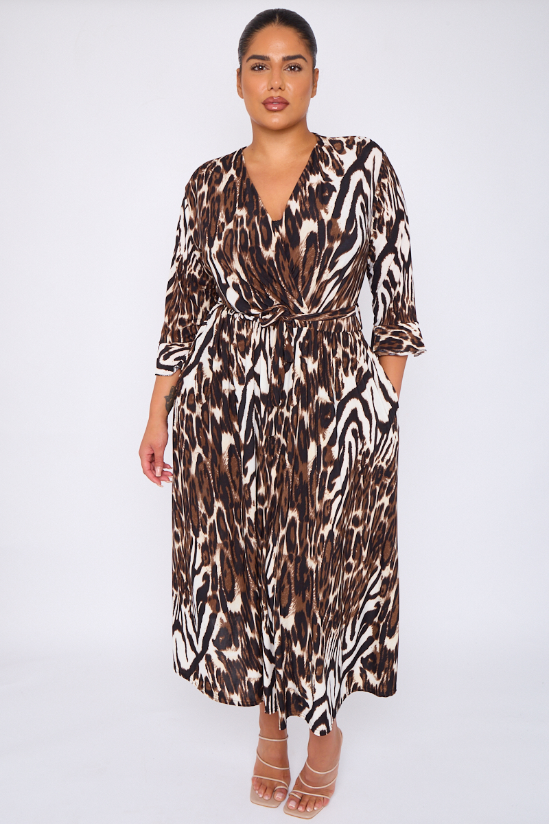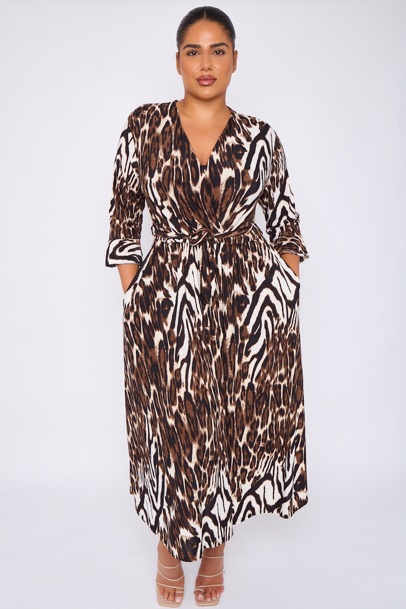 Plus Size Printed 3/4 Sleeves Wrap Tie Waist Midi Dress With Pockets x 5