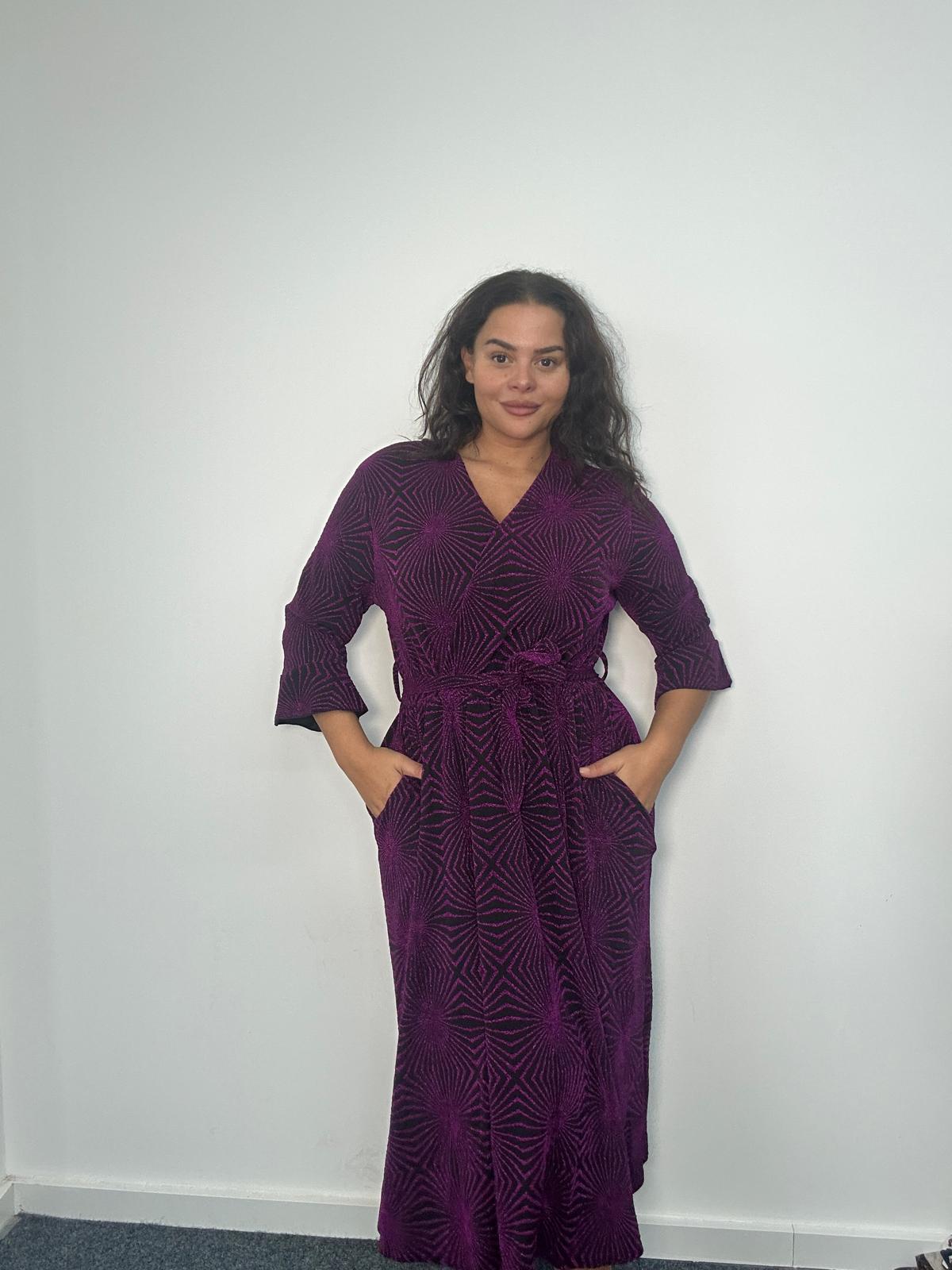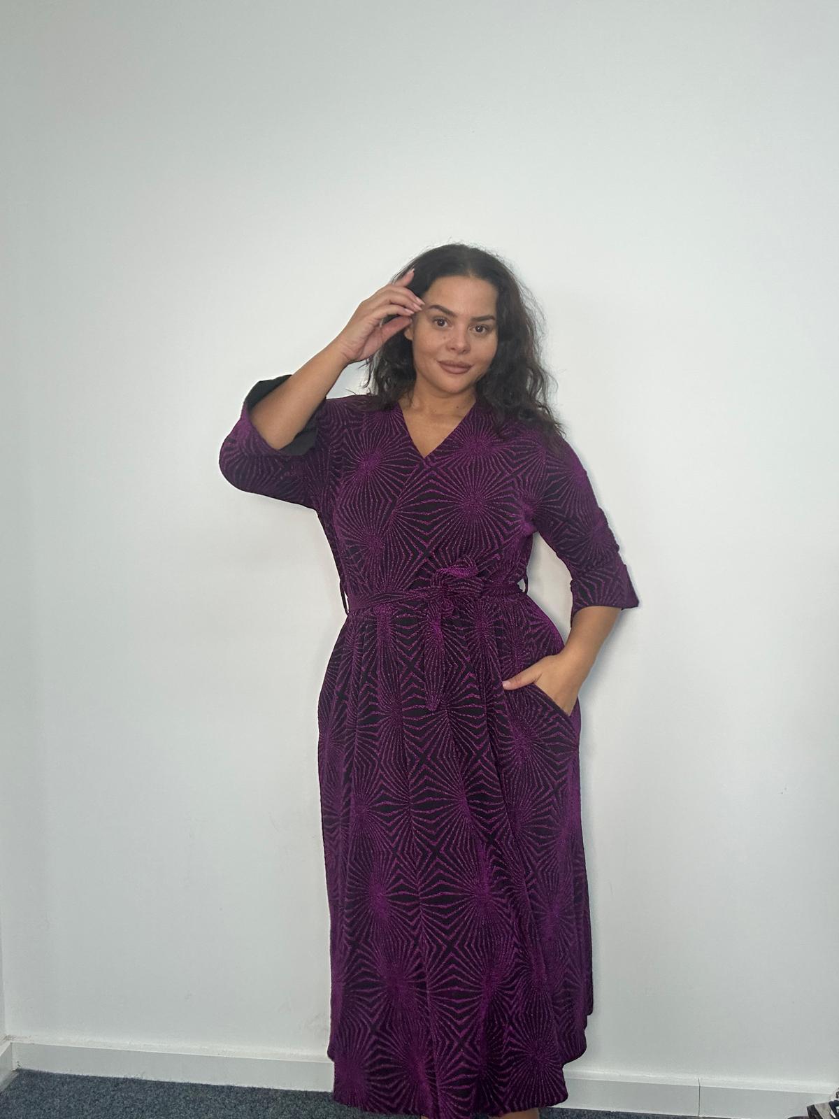 Elevate your plus size collection with this elegant velvet sheen geo print wrap dress. Crafted from a soft, stretch fabric with a subtle sheen, it features a striking geometric pattern that catches the light beautifully. The flattering wrap design with a tie waist creates a defined silhouette, while the midi length and 3/4 sleeves make it perfect for both daytime sophistication and evening glamour. A stunning choice for boutiques and online sellers looking to stock standout plus size occasionwear.