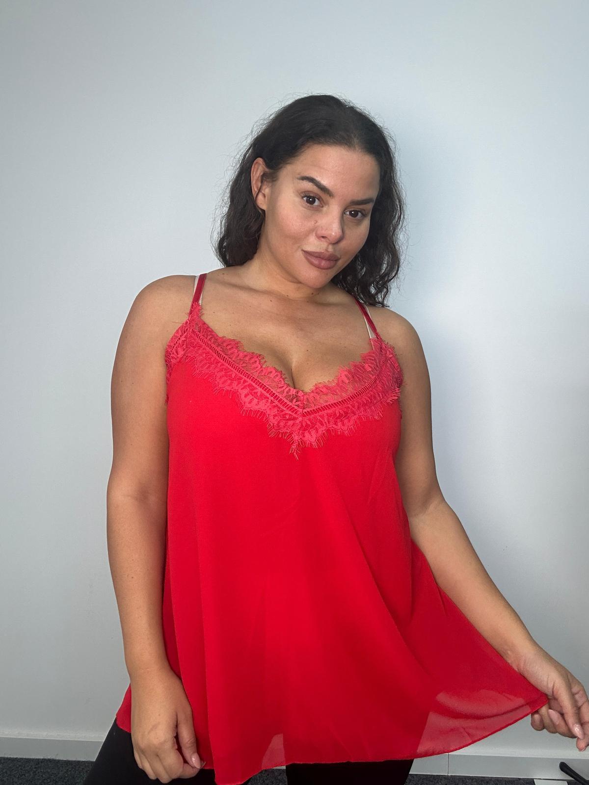 Add a pop of colour to your plus size collection with this stunning red lace trim cami top. Designed with a flattering relaxed fit, it features delicate lace detailing at the neckline and adjustable straps for the perfect fit. Made from a lightweight, flowy fabric that drapes beautifully, this cami is ideal for layering or wearing on its own for a bold, feminine look. Perfect for boutiques and online retailers seeking standout pieces that combine comfort and style.