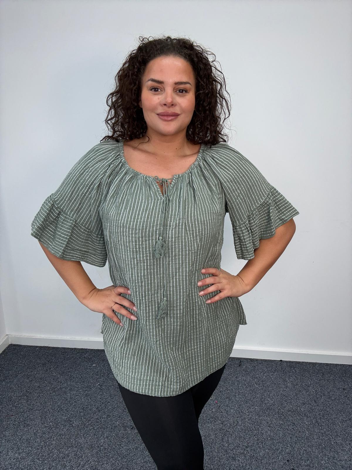 Plus Size Green Stripe Tassel Tie Blouse with Flared Sleeves x 2, 3 & 5 Pack Options