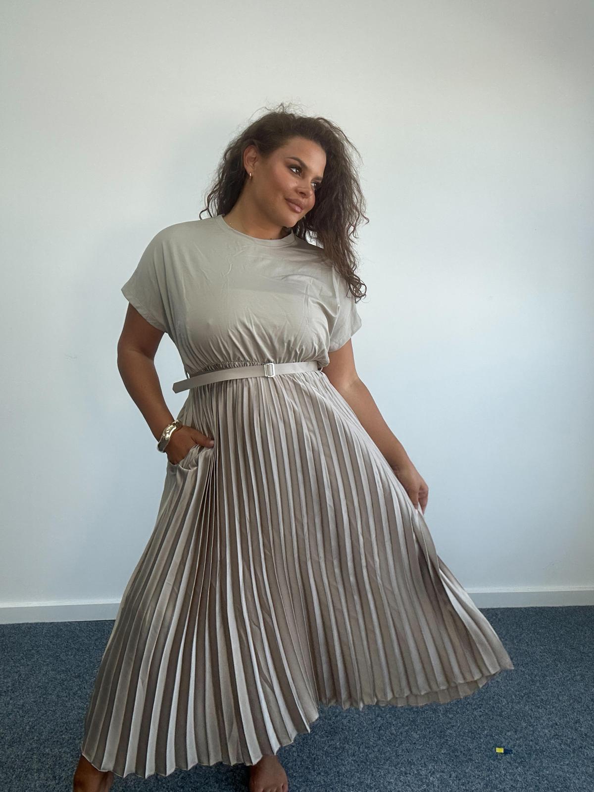 Plus Size Stone Pleated Belted Midi Dress Elegant Curve Fit with Pockets x 5