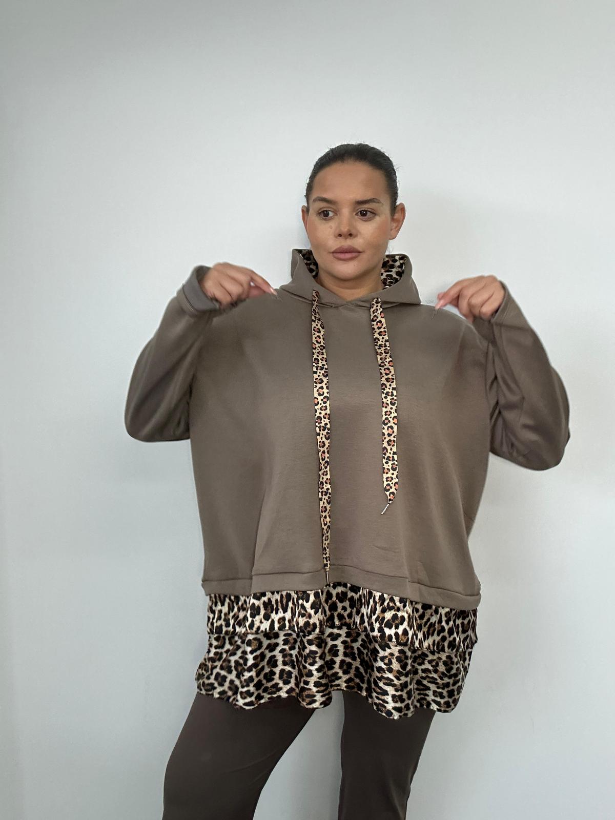 Add a bold twist to casualwear with this Plus Size Hoodie with Leopard Print Trim a perfect blend of comfort and statement style. Crafted from soft, medium-weight fabric, this hoodie features leopard print drawstrings, hood lining, and a tiered hem, adding a touch of animal print flair to a relaxed silhouette. Designed with an oversized fit, long sleeves, and a kangaroo pocket, it’s ideal for layering over leggings or jeans for a chic off-duty look. A standout wholesale piece that brings cosy luxury and playful edge to your plus-size collection.