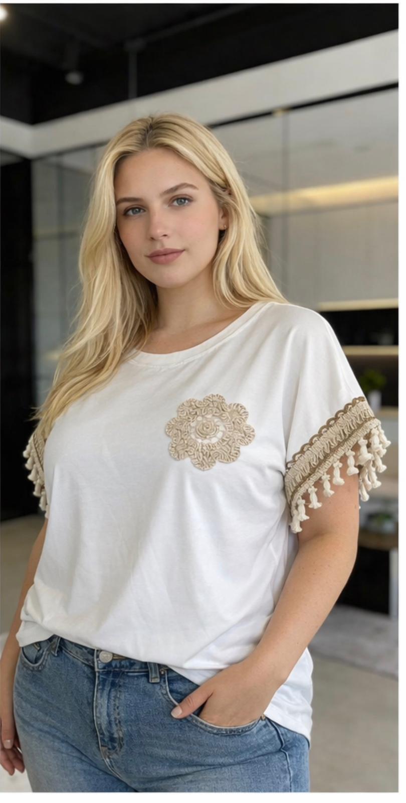 Plus Size White Crochet Detail Tassel Sleeve T-Shirt x 2, 3 & 5 Pack Options