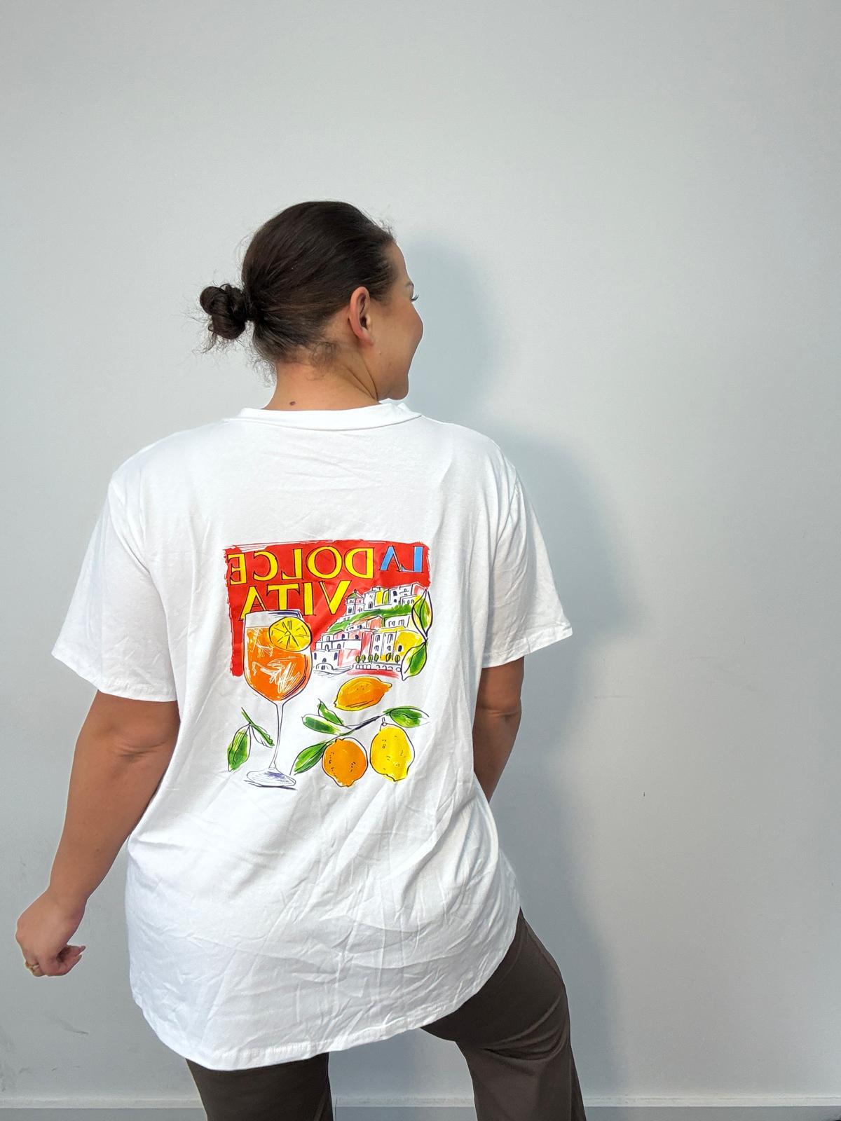• The Dolce Vita Lemon Graphic Oversized T-Shirt brings Mediterranean-inspired charm to everyday curve dressing. Designed in a relaxed, oversized silhouette, this tee offers a flattering drape and comfortable fit that works effortlessly on plus size bodies. Featuring a vibrant Dolce Vita back print with lemon and Aperol-inspired artwork, alongside a coordinating front chest detail, it delivers standout appeal while remaining easy to wear. Crafted from soft cotton jersey, it ensures breathability and all-day comfort. Ideal for casual styling with leggings, denim, or relaxed tailoring, this tee transitions seamlessly from seasonal collections to core wardrobe edits. A strong wholesale option for retailers looking to offer trend-led yet wearable plus size pieces with broad customer appeal.