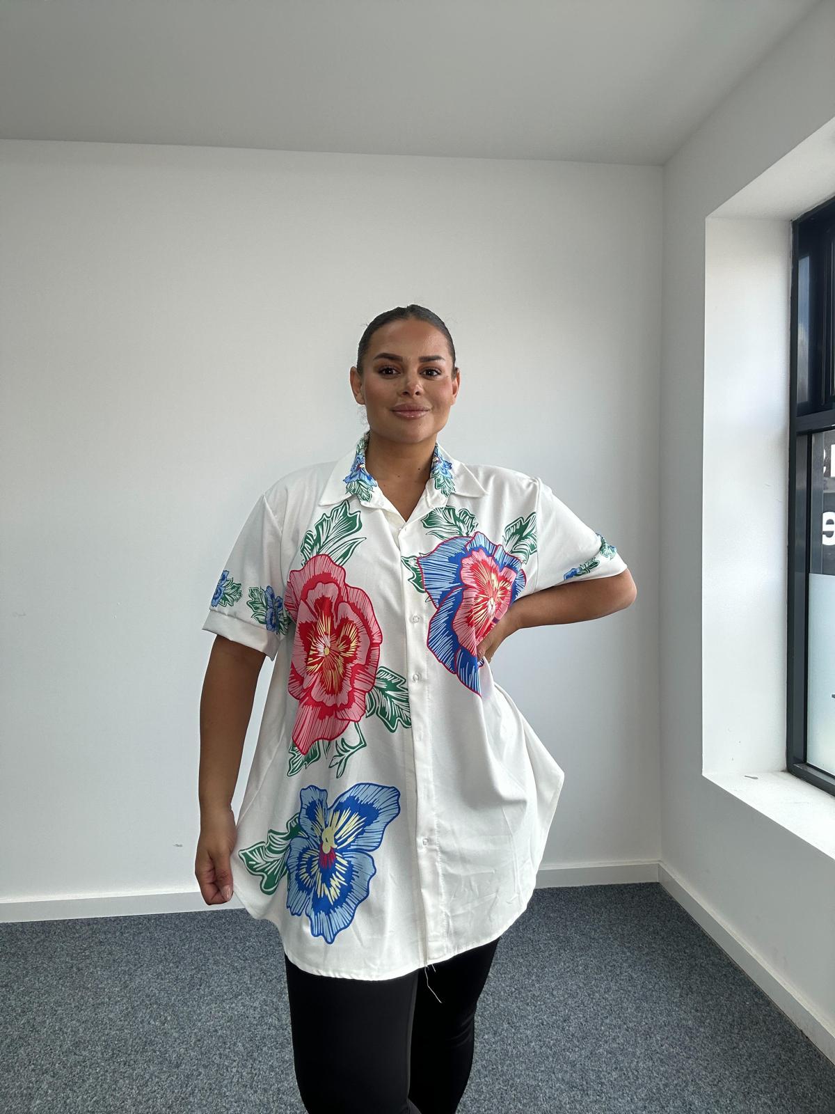 Plus Size White Floral Print Shirt with Button Front and Short Sleeves x 5