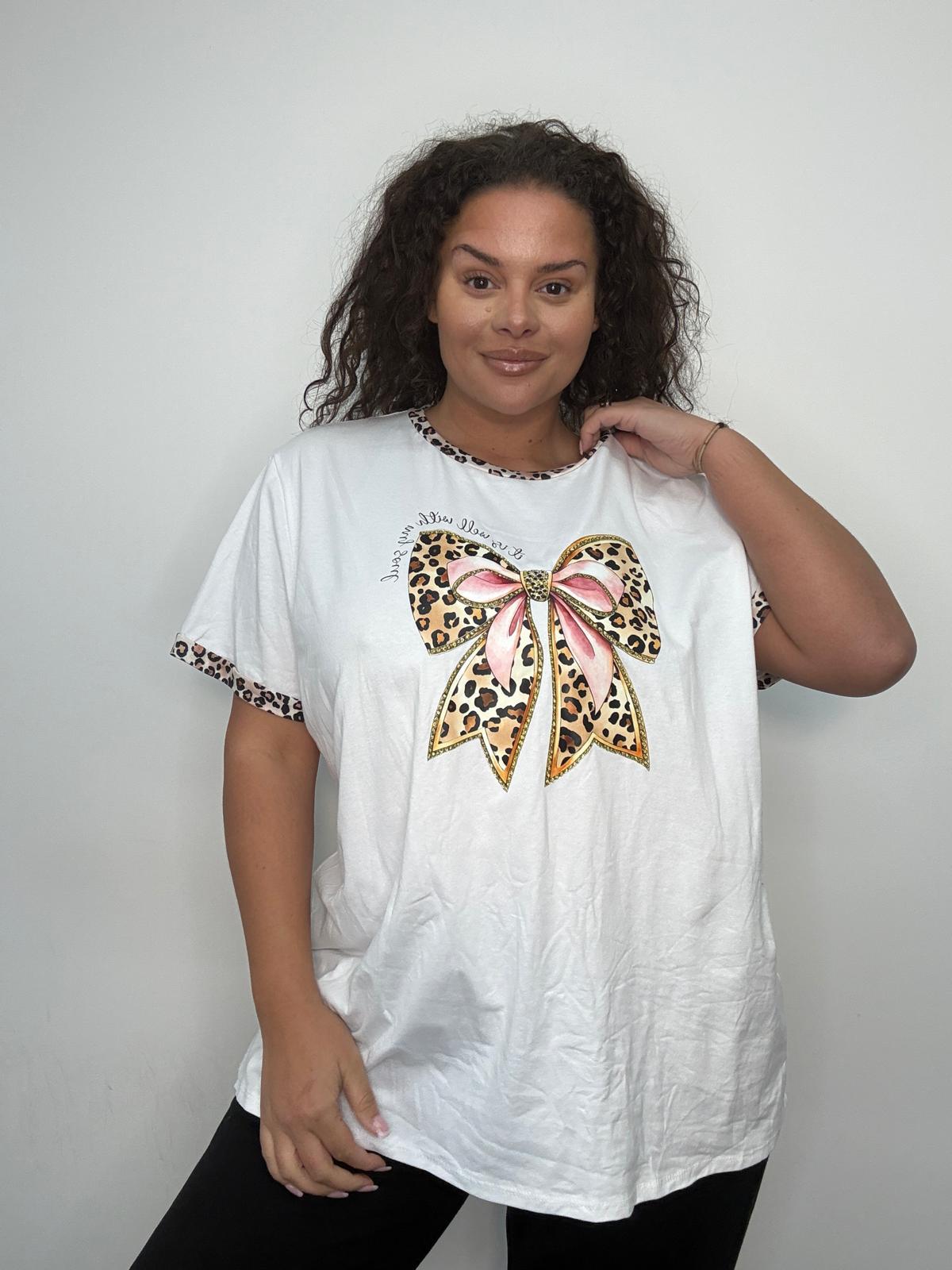 This plus size T-shirt blends feminine detail with everyday wearability, making it a strong commercial piece for curve collections. Featuring a statement leopard print bow design to the front, complemented by contrast leopard trim at the neckline and sleeves, it offers visual interest while remaining easy to style. Cut in a relaxed, flattering fit and crafted from a soft, breathable fabric, this style delivers all-day comfort with standout shelf appeal. Ideal for casual dressing, boutique edits, and trend-led plus size ranges, it pairs effortlessly with leggings, jeans, or tailored casual bottoms. A versatile and eye-catching option for UK wholesale buyers looking to refresh their plus size T-shirt offering.
