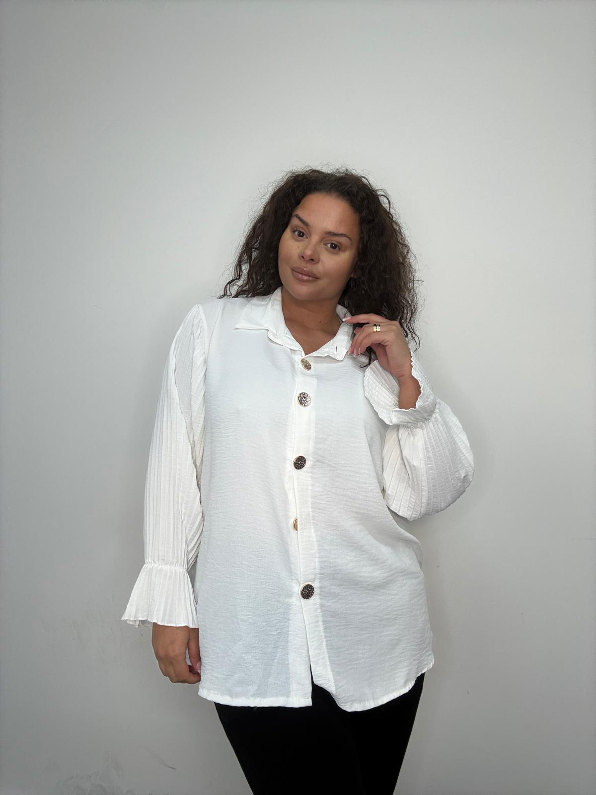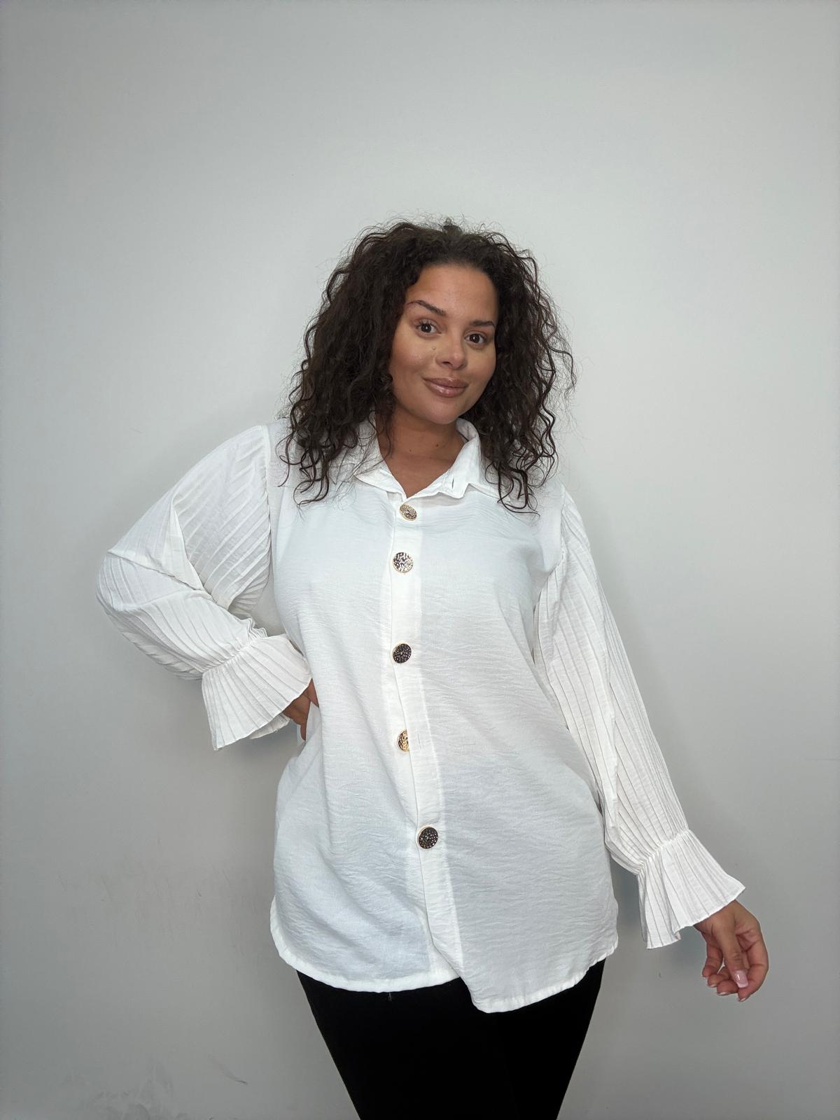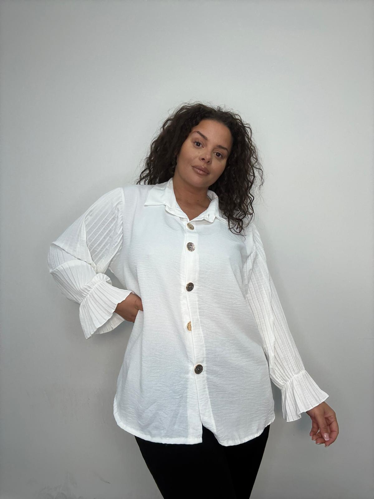 This plus size button-through shirt is a refined curve essential that combines classic styling with feminine detailing. Designed in a relaxed, flattering fit, it features statement pleated sleeves with softly flared cuffs, adding texture and interest while remaining easy to wear. The lightweight fabric drapes beautifully over the body, offering comfort and breathability for all-day wear. Finished with a classic collar and decorative button fastening, this style works effortlessly across casual, workwear, and smart-casual edits. A versatile, easy-selling option for UK wholesale buyers seeking elevated plus size staples with strong commercial appeal.