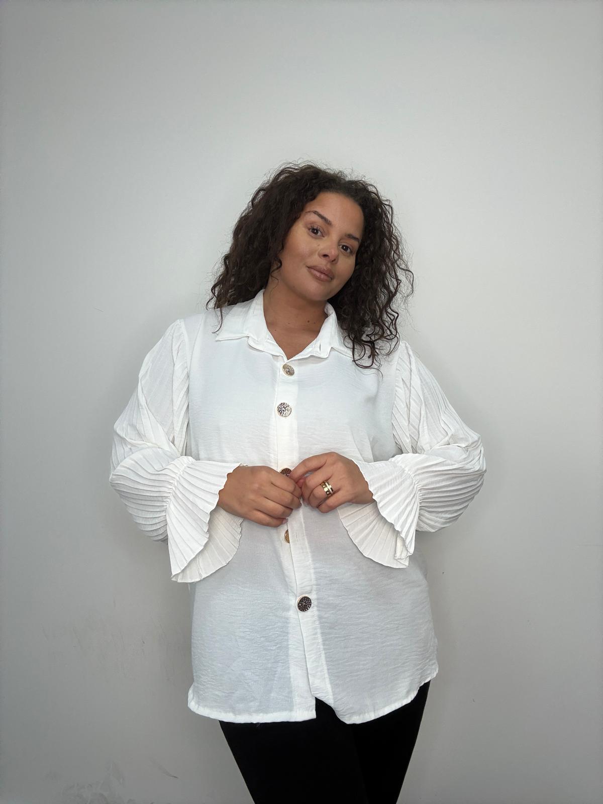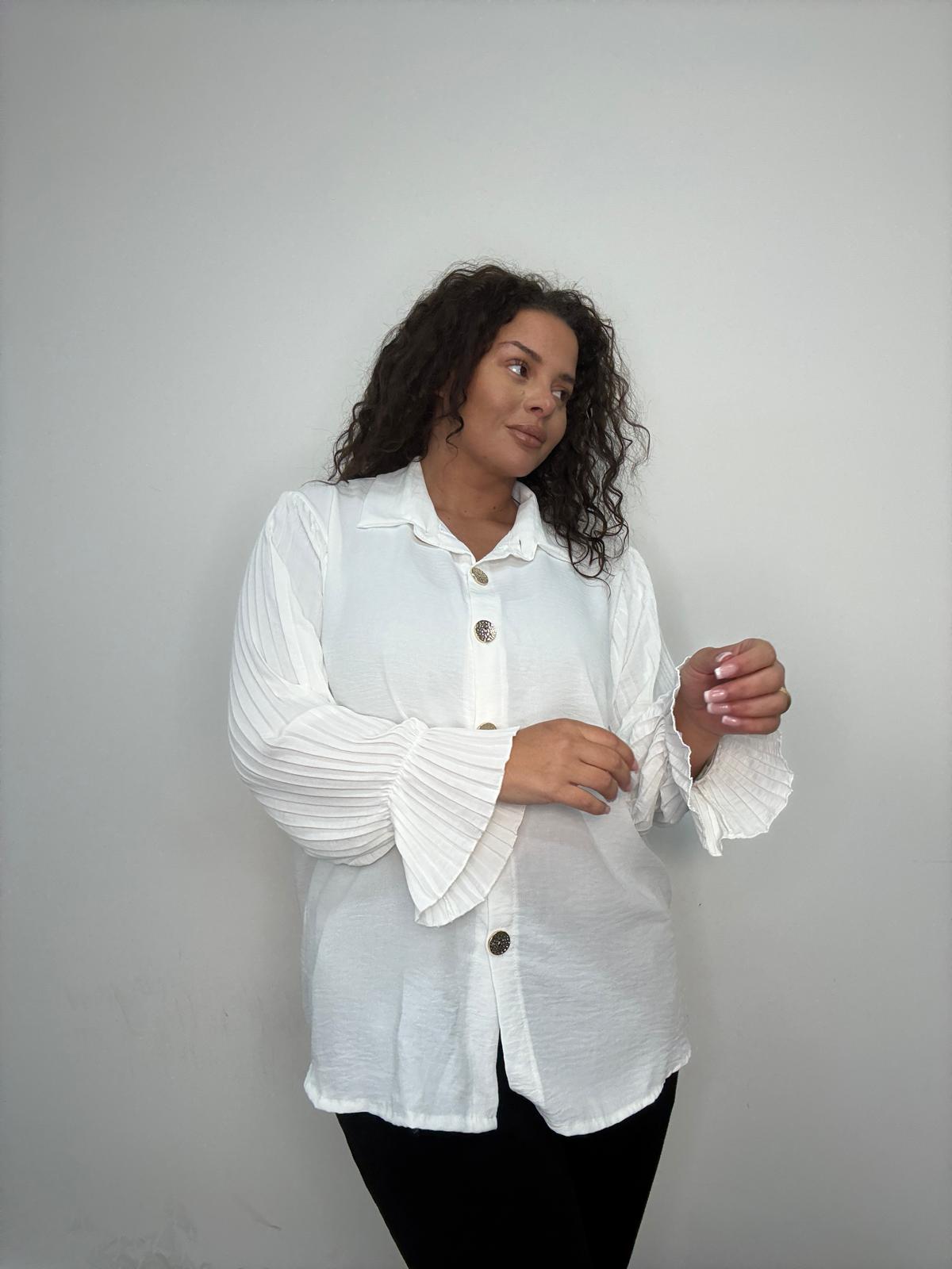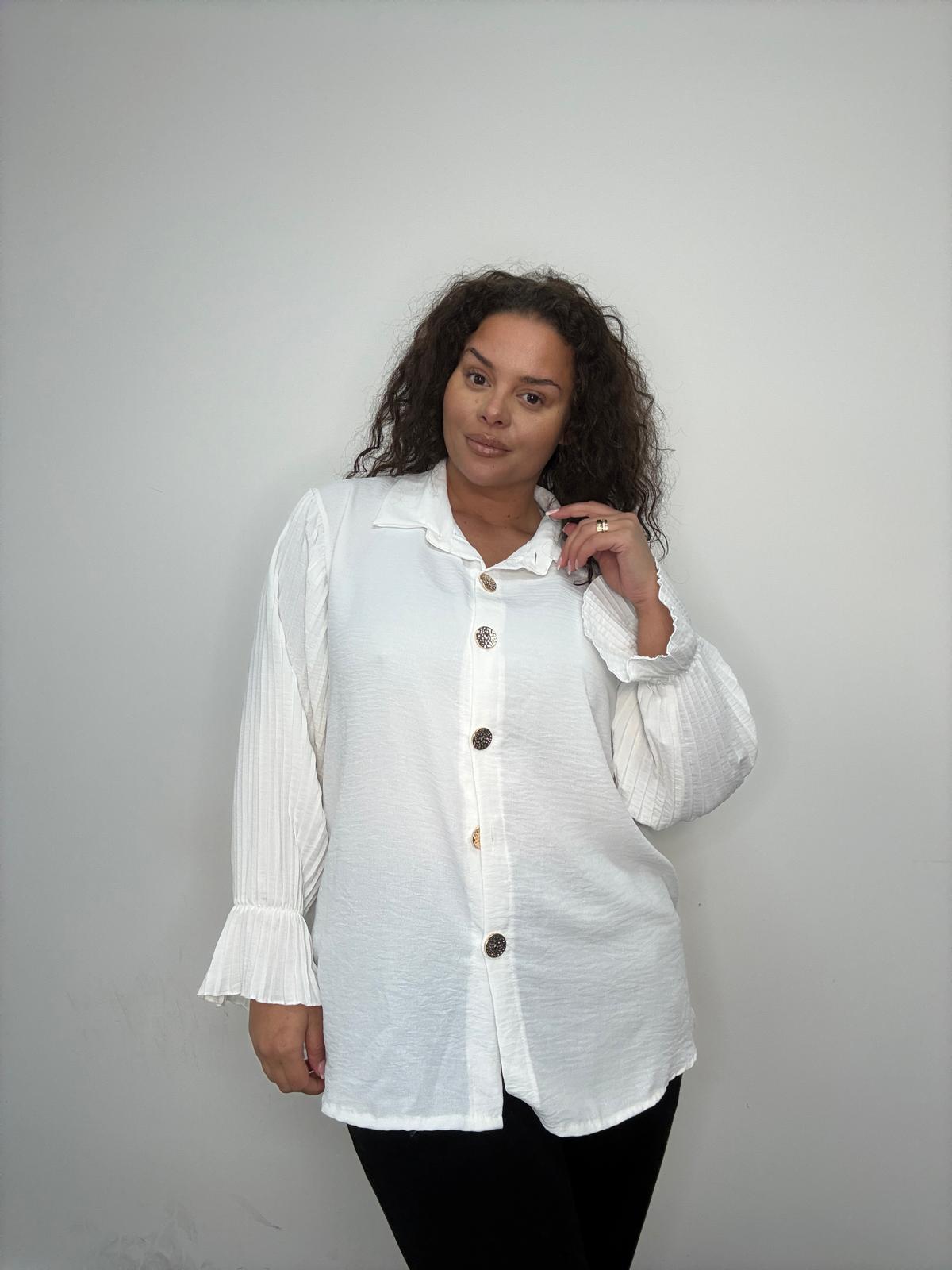 This plus size button-through shirt is a refined curve essential that combines classic styling with feminine detailing. Designed in a relaxed, flattering fit, it features statement pleated sleeves with softly flared cuffs, adding texture and interest while remaining easy to wear. The lightweight fabric drapes beautifully over the body, offering comfort and breathability for all-day wear. Finished with a classic collar and decorative button fastening, this style works effortlessly across casual, workwear, and smart-casual edits. A versatile, easy-selling option for UK wholesale buyers seeking elevated plus size staples with strong commercial appeal.