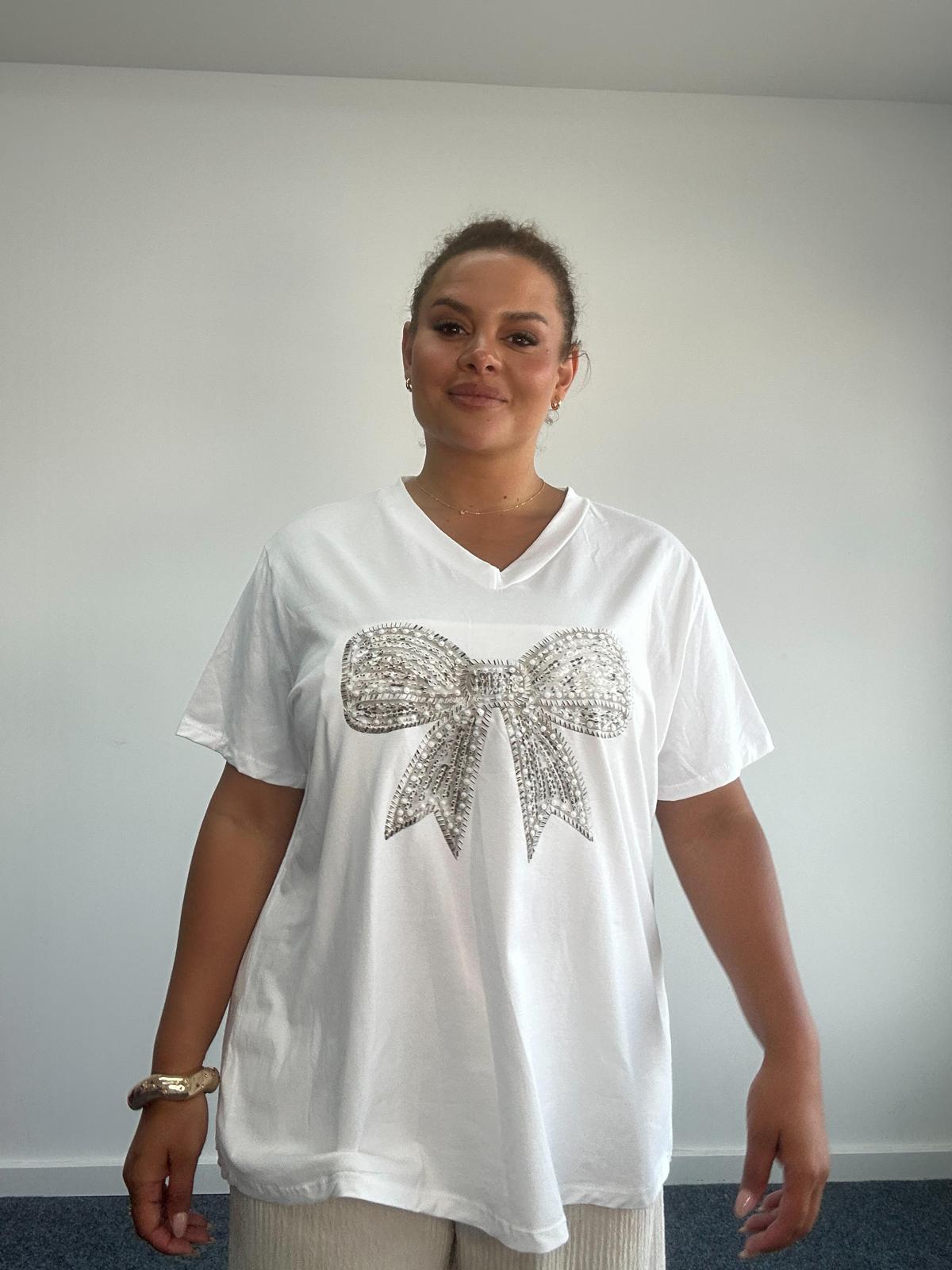 Plus Size White Sequin Bow Graphic V Neck T Shirt – Curve Fit x 5