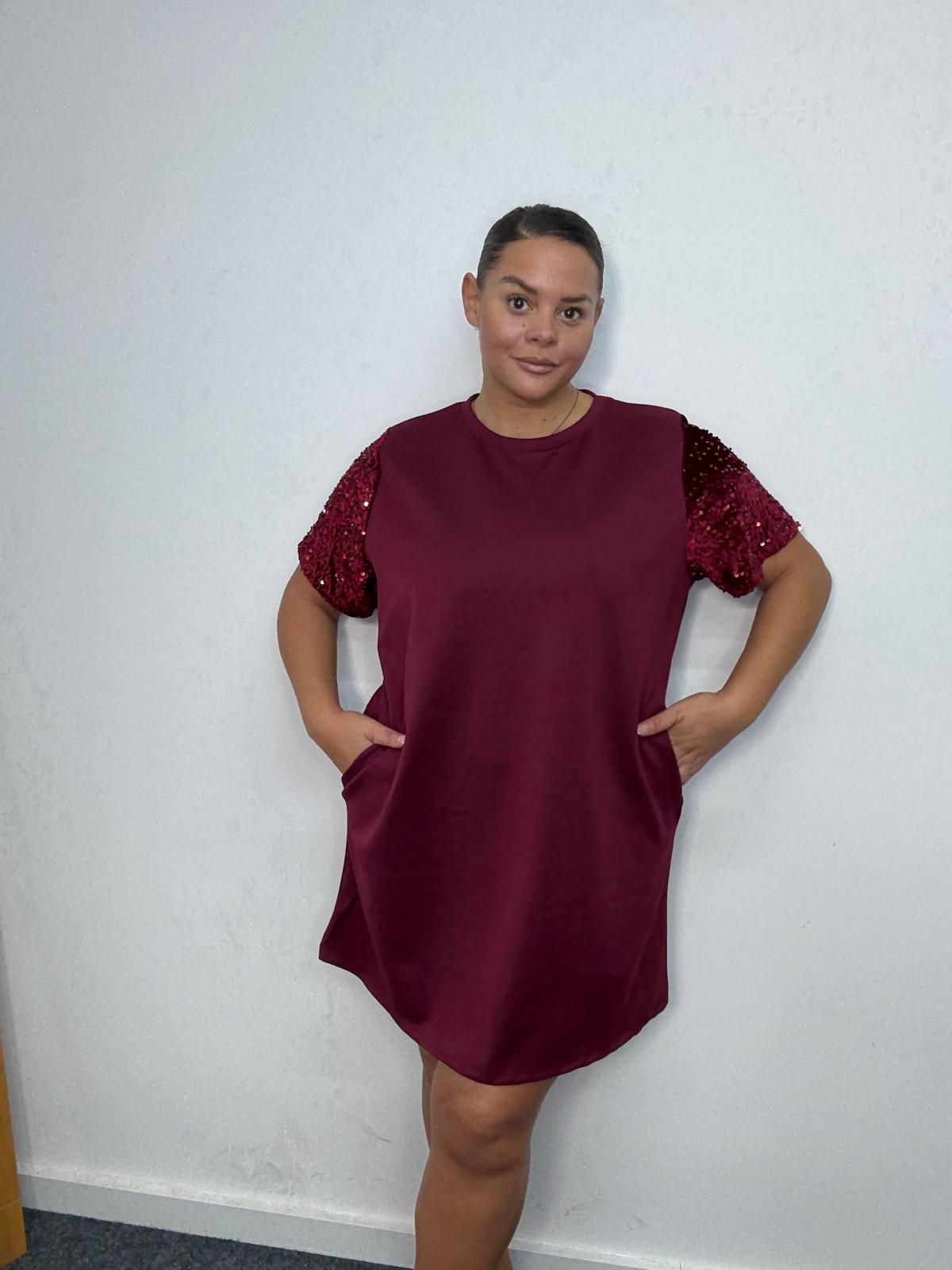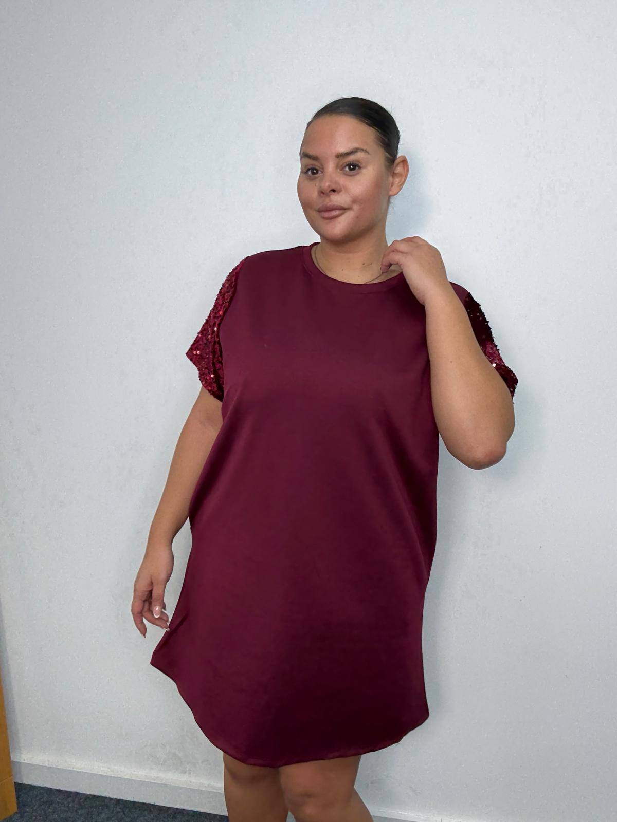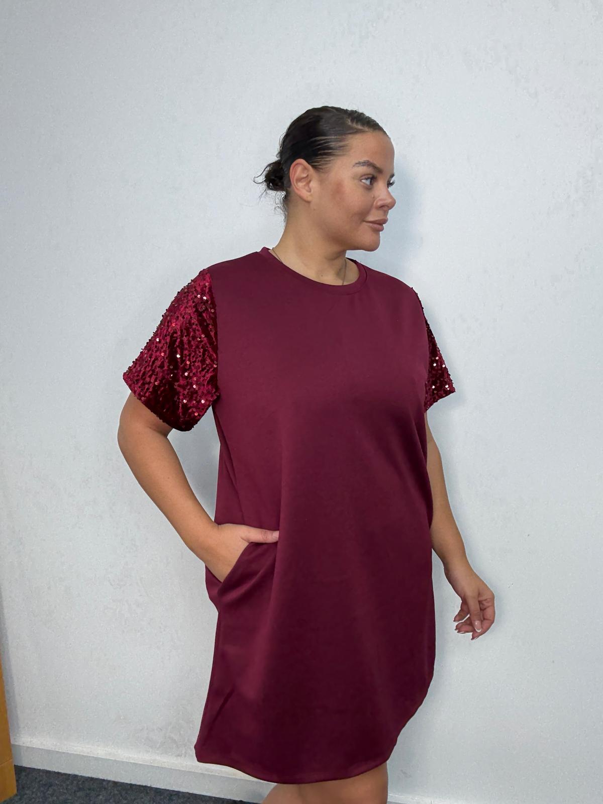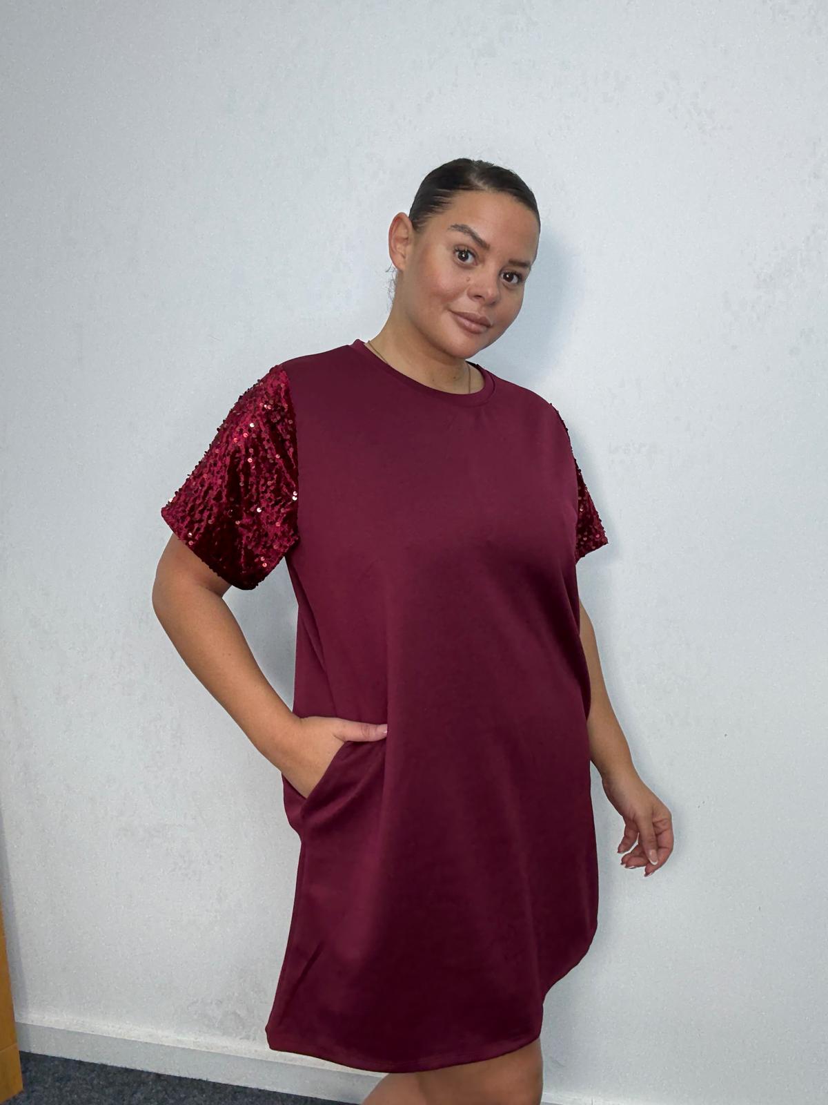 Bring sparkle to everyday styling with this plus-size sequin sleeve t-shirt dress. Designed in a flattering relaxed silhouette, this piece blends comfort with subtle glamour. The shimmering sequin short sleeves elevate the look, making it ideal for casual party edits, festive drops, and day-to-night outfit options. Finished with a round neckline and convenient side pockets, it’s a must-have style that offers retailers effortless versatility and strong seasonal sales potential.