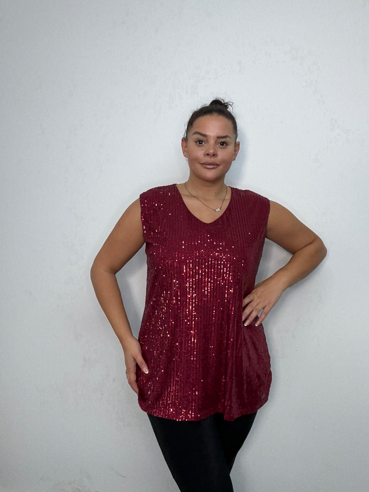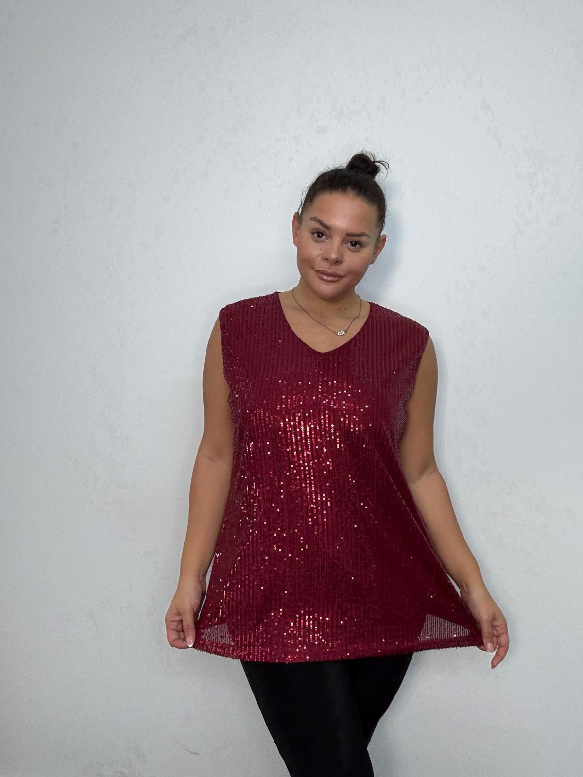 Bring effortless glamour to your partywear line with this stunning plus-size sleeveless sequin tunic top. Featuring a flattering v-neck and an elegant longline silhouette, this piece offers both sparkle and comfort. Fully embellished in shimmering sequins, it’s perfect for festive edits, evening outfits, and special occasions. Designed to drape beautifully over the body, this tunic pairs easily with leggings, trousers, or faux leather pieces, making it a must-have style for retailers looking to elevate their plus-size occasionwear offering.