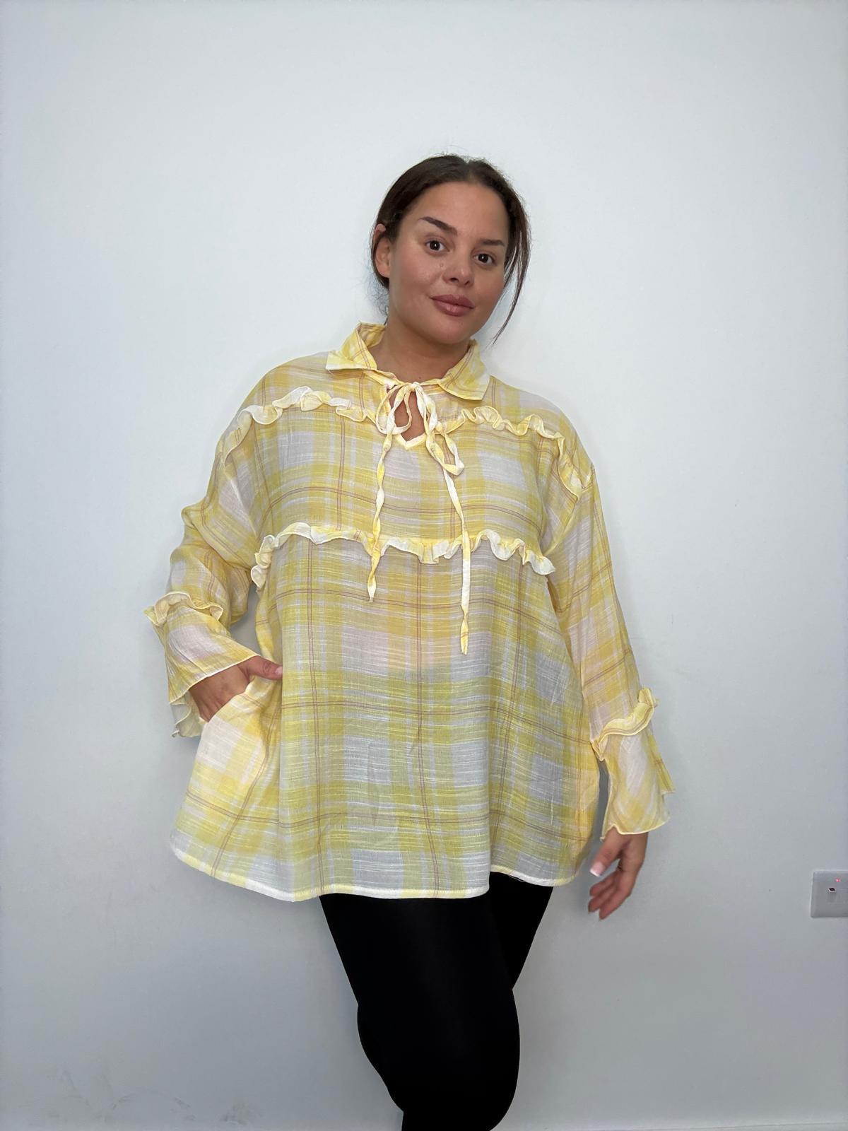 Our Plus Size Frill Detail Check Blouse Top blends classic pattern with soft feminine styling for an easy-to-wear statement piece. Crafted from a lightweight woven fabric, this blouse features an all-over check design with decorative frill trims across the chest and sleeves for added texture and visual interest. Designed with a tie neckline and relaxed silhouette, it offers comfort while maintaining a flattering shape for curve figures. The longer length provides confident coverage, making it perfect for pairing with leggings, trousers or denim for both casual and smart-casual collections. Ideal for boutique ranges, transitional seasons and everyday curve fashion, this blouse delivers strong commercial appeal with timeless styling.