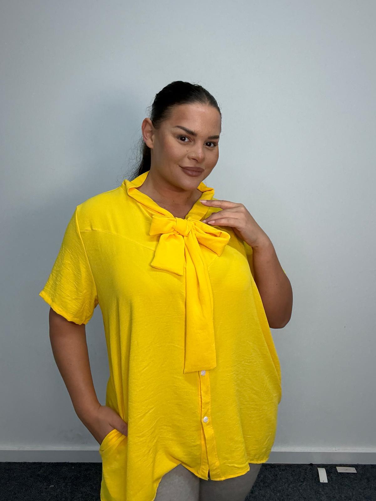 Plus Size Yellow Tie Neck Button Front Blouse with Pockets x 2, 3 & 5 Pack Options